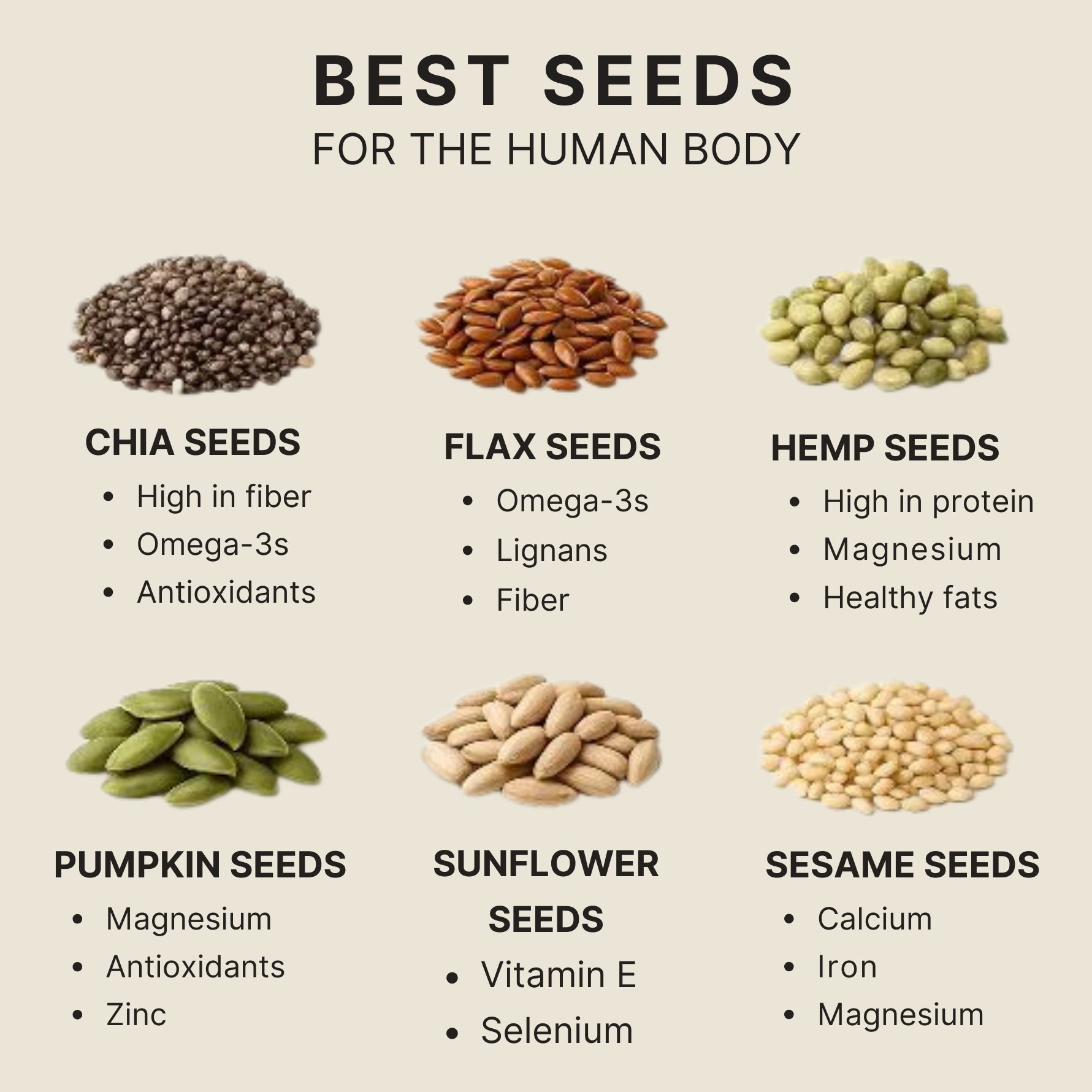 Seeds are small but are mighty sources of essential nutrients that play an important role in a healthy diet. They are rich in protein, fiber, healthy fats, vitamins, and minerals. Varieties such as chia, flax, sunflower, and pumpkin seeds can support heart health, aid digestion, and boost energy levels. Packed with antioxidants and omega-3 fatty acids, they also help reduce inflammation and protect against chronic diseases. Versatile and easy to use, seeds can be sprinkled over salads, blended into smoothies, or added to baked goods—making them a simple yet powerful way to enhance overall wellness.
